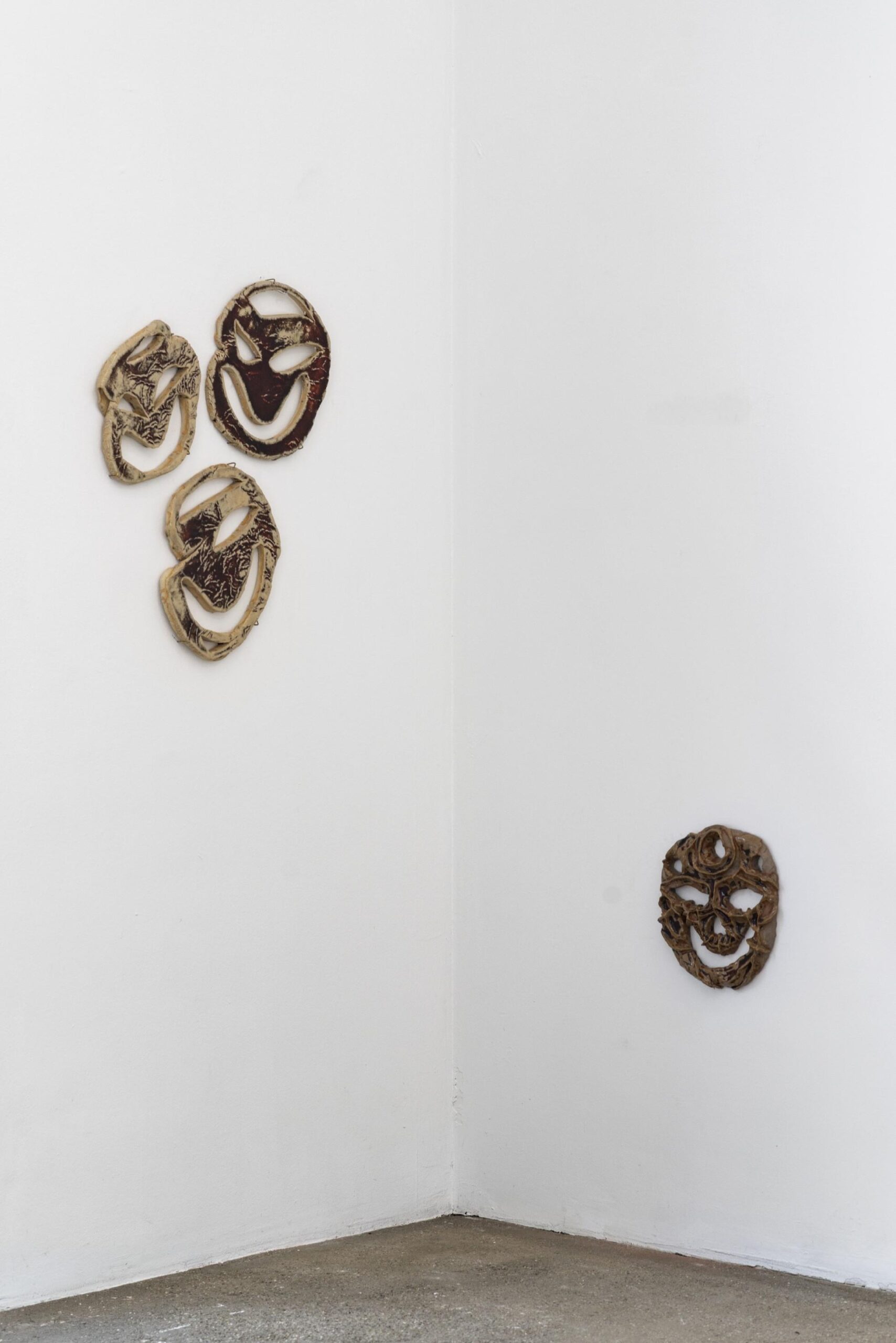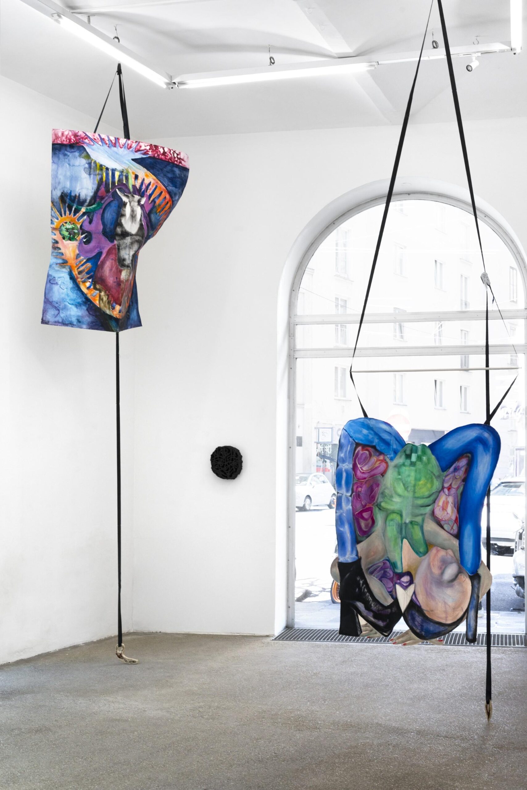 Ari Pilhofer develops an expanded understanding of painting as an unstable system that unfolds across canvas, body, sculpture, and digital media. Their works operate with queer-coded, hybrid figures – masks, limbs, insect bodies, ritually charged shadow beings – that resist clear representation. Instead of producing a coherent image, Pilhofer creates transitions, blurrings, permeabilities. Often floating in their installation, their paintings appear as bodies – vulnerable, soft, multiple – while also serving as carriers of techno-symbolic transformation. Analog and digital processes intertwine: painted surfaces are scanned, altered, and translated into sculpture, ceramics, or clothing. These processes generate a techno-magical imagery in which symbols, surfaces, and bodies merge. Pilhofer understands softness, repetition, and craft – through sewing, casting, layering – not as ornamental gestures but as political strategies of resistance and recoding. The recurring archetype of the Spider-Knight functions as a fluid vessel of collective practices of protection and refusal. Their works undermine categorical divisions between subject and object, materiality and immateriality, generating a pictorial practice of re-ritualization in which digital and immaterial ghosts merge into tangible artifacts.