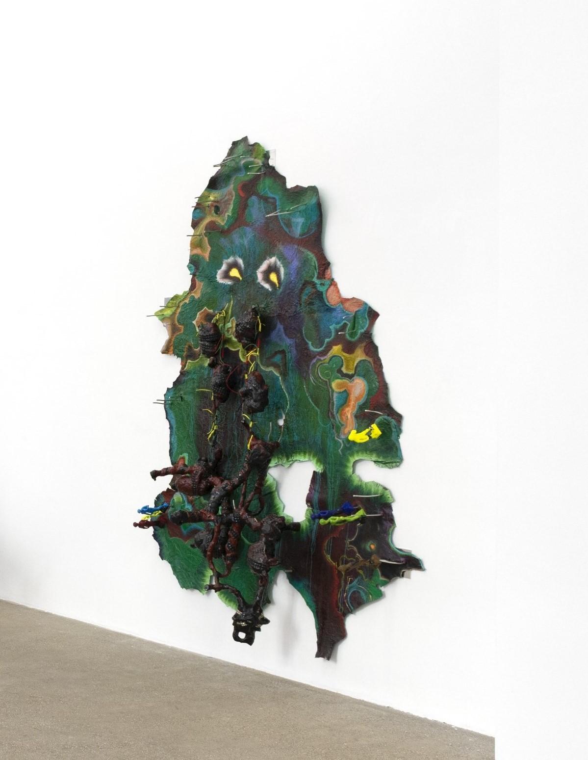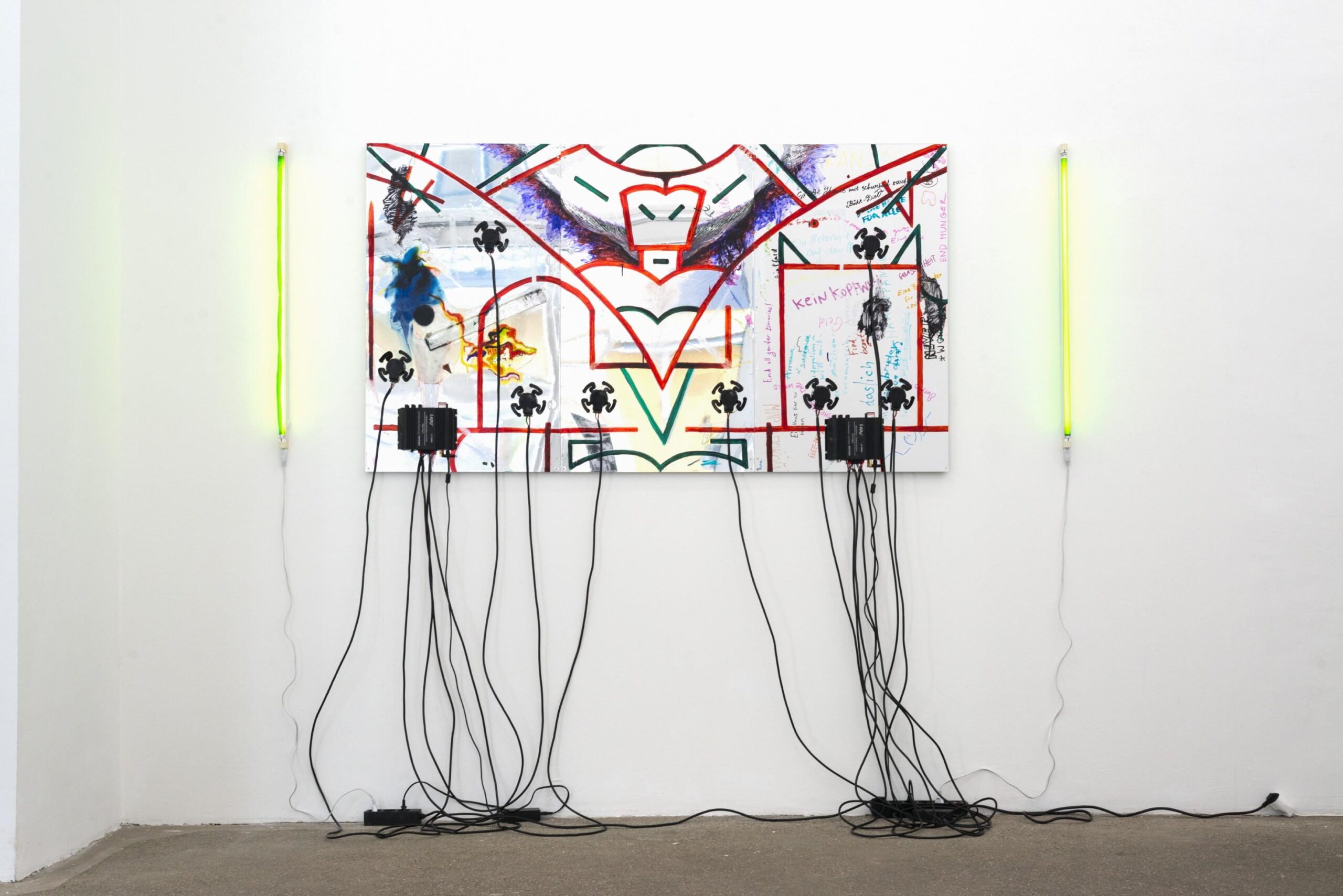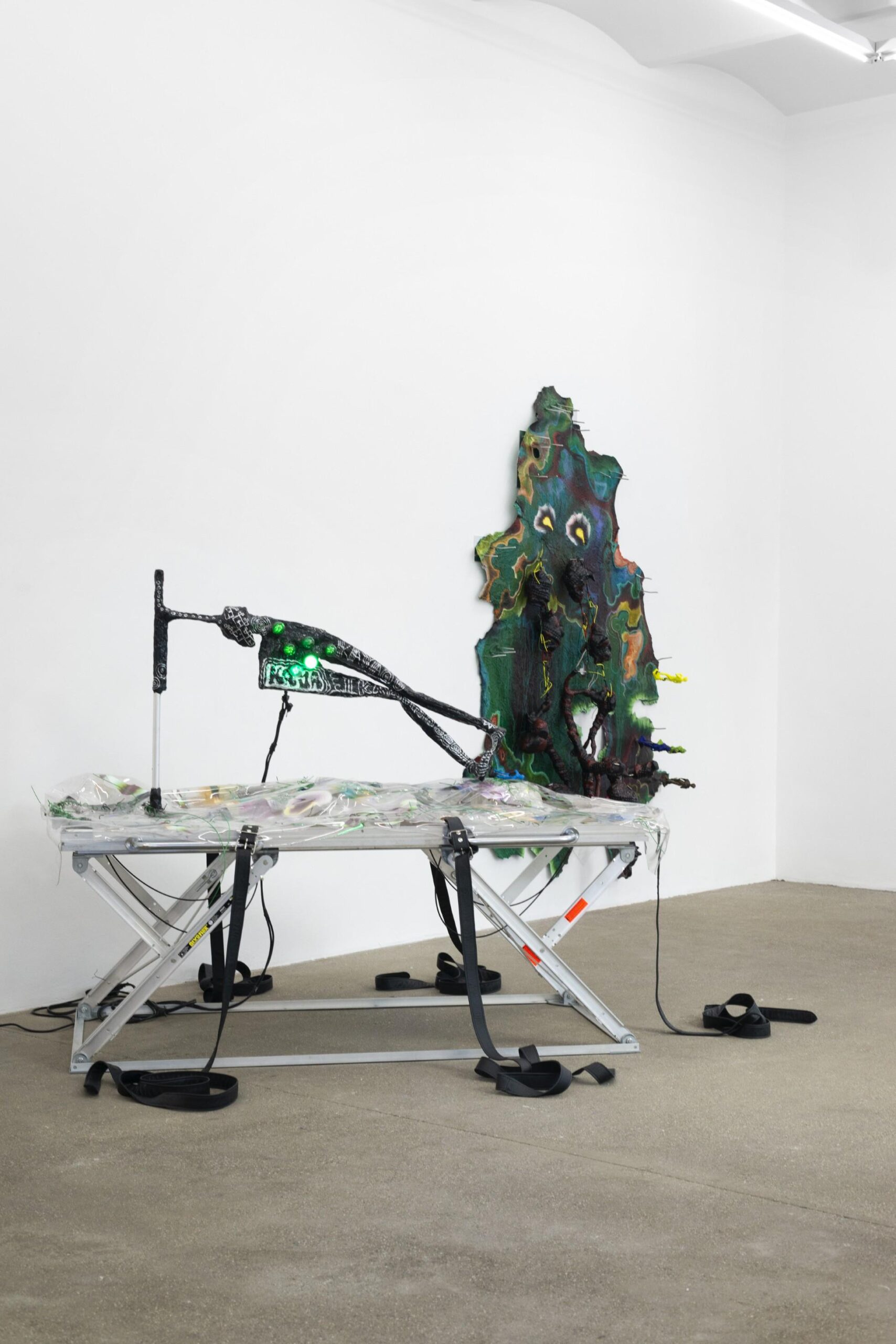 For KAYA – a collaborative project founded in 2010 by Kerstin Brätsch and Debo Eilers, sometimes joined by the namesake Kaya Serene – painting is negotiated as an unstable, transmedial constellation. This configuration resists the idea of coherent artistic identity, instead developing an “anti-I” in which authorship is not represented but organized as a processual, fluid instance. KAYA does not operate from a subject but as a situational formation in which painting, body, and object enter into unstable relations, whereby the object itself assumes subject-status and is charged with experiences, social encounters, but also with violence. In the work SPREPPER_SCHNAKEN Table #1 (2015) – a dissecting-table-like display with body casts of Kaya and a painting on polyester foil strapped down with tension belts – the painterly gesture is brought into tension with the material presence of the body. The strapping of both painting and body, along with visible markings by coins, point to a radical visualization of capitalization processes: painting functions here not as a site of subjective self-expression, but as a vehicle of economic inscription – just as the body becomes a bearer of value attributions and part of circulating markets. Painting turns into a porous membrane between object, subject, and system.
