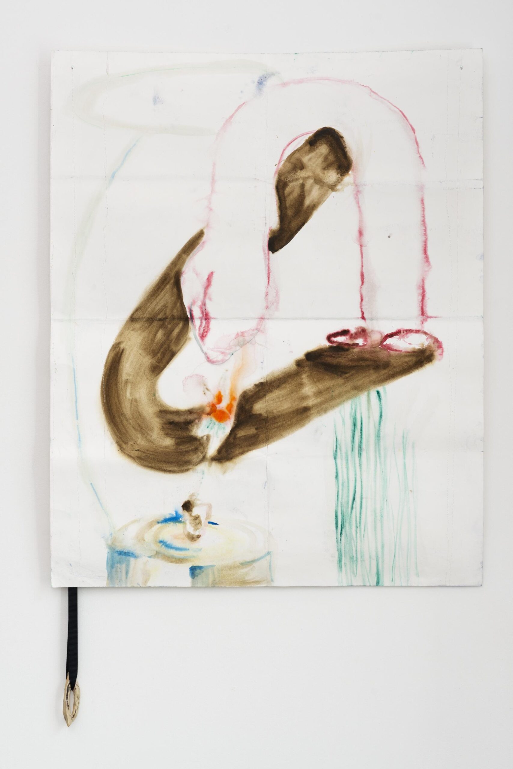 For Maria VMier, too, painting is not a closed pictorial form but a relational formation – a complex of gesture, surface, texture, and body. Their works on folded paper destabilize the classical conception of the painting as a coherent surface. Instead, they fragment space and picture support into units of attention, dissolving both the centered, authoritative gaze and the idea of a singular artistic expression. Their practice articulates itself as a “companion-system” – a non-hierarchical interweaving of picture support and space, of producer(s) and viewer(s). In their work Das Ende des Kapitalismus [mit LJ Jeschke], VMier reflects on their own role as producer within the tension between artistic appropriation and economic embedding: instead of merely responding with a linguistic reference to the titular quotation from Lisa Jeschke’s text Alien / Care / Wall, VMier proposes a form of participation and visibility. Their painting not only formally resists the product logic of capitalist image production but also subverts its valorization logic – through processes of return, cooperation, and situational presence. The gesture is not erased, but becomes an identitarian part of the work itself.