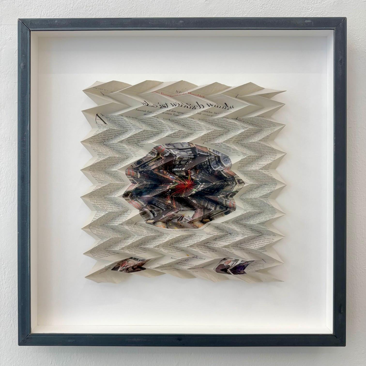 Since 2011, Peter Sandbichler has been developing his series “Origami”, in which individual pages of the German weekly newspaper DIE ZEIT are transformed into sculptural reliefs through precise folding patterns such as herringbone structures. The originally flat, linear surface is thus turned into a topographical configuration that oscillates between image and sculpture. Texts and images from the newspaper remain partially visible but lose their immediate legibility, becoming ornamental structures of light and shadow. In this way, perception shifts: instead of informational content, the materiality and form of the surface take center stage.