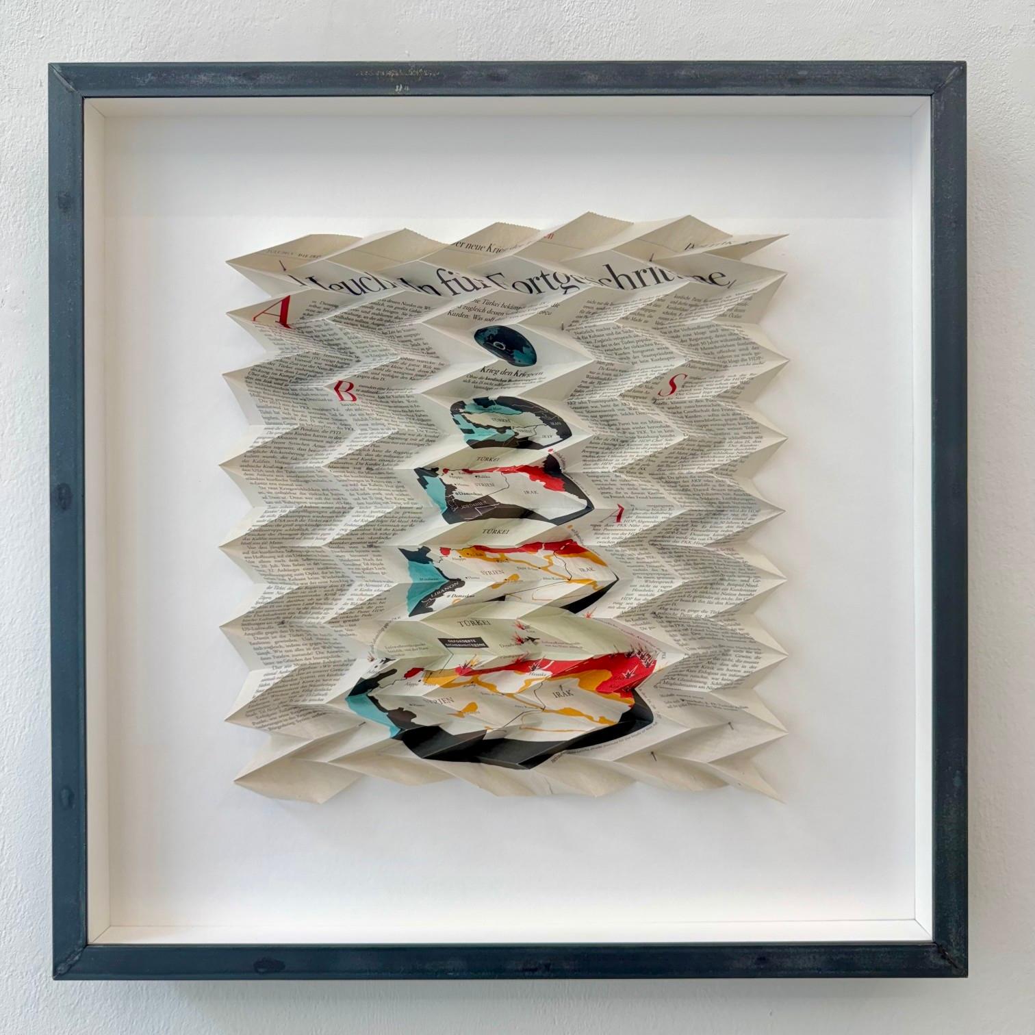Since 2011, Peter Sandbichler has been developing his series “Origami”, in which individual pages of the German weekly newspaper DIE ZEIT are transformed into sculptural reliefs through precise folding patterns such as herringbone structures. The originally flat, linear surface is thus turned into a topographical configuration that oscillates between image and sculpture. Texts and images from the newspaper remain partially visible but lose their immediate legibility, becoming ornamental structures of light and shadow. In this way, perception shifts: instead of informational content, the materiality and form of the surface take center stage.