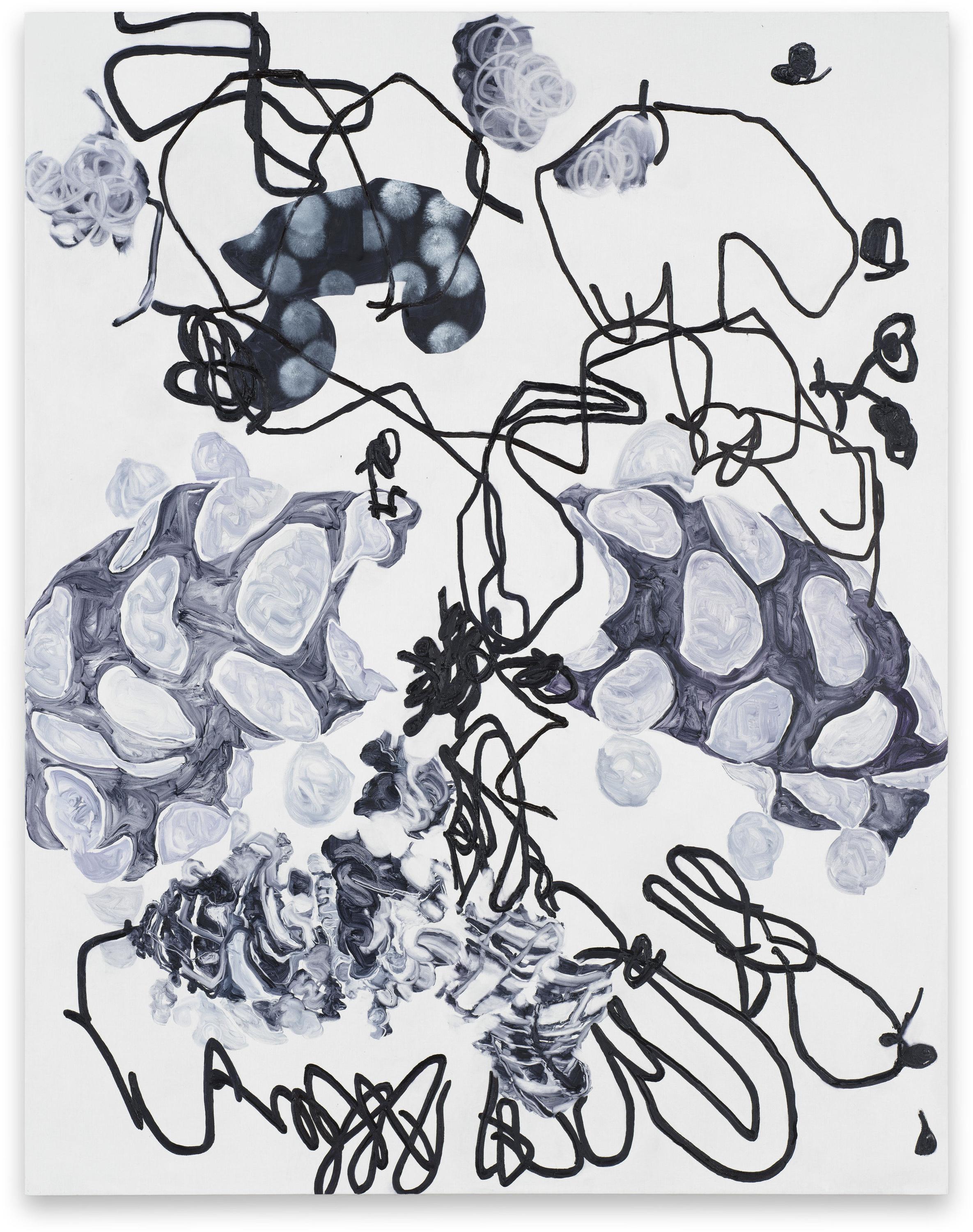 Maria Brunner’s new body of work unfolds as a meditation on her process. The artist has constructed a space in which her work is neither confined to the canvas nor bound to defined representation. The lines painted on the walls of the gallery are to be seen as extensions of the architecture, framing the works and guiding the viewer fluidly through the space.