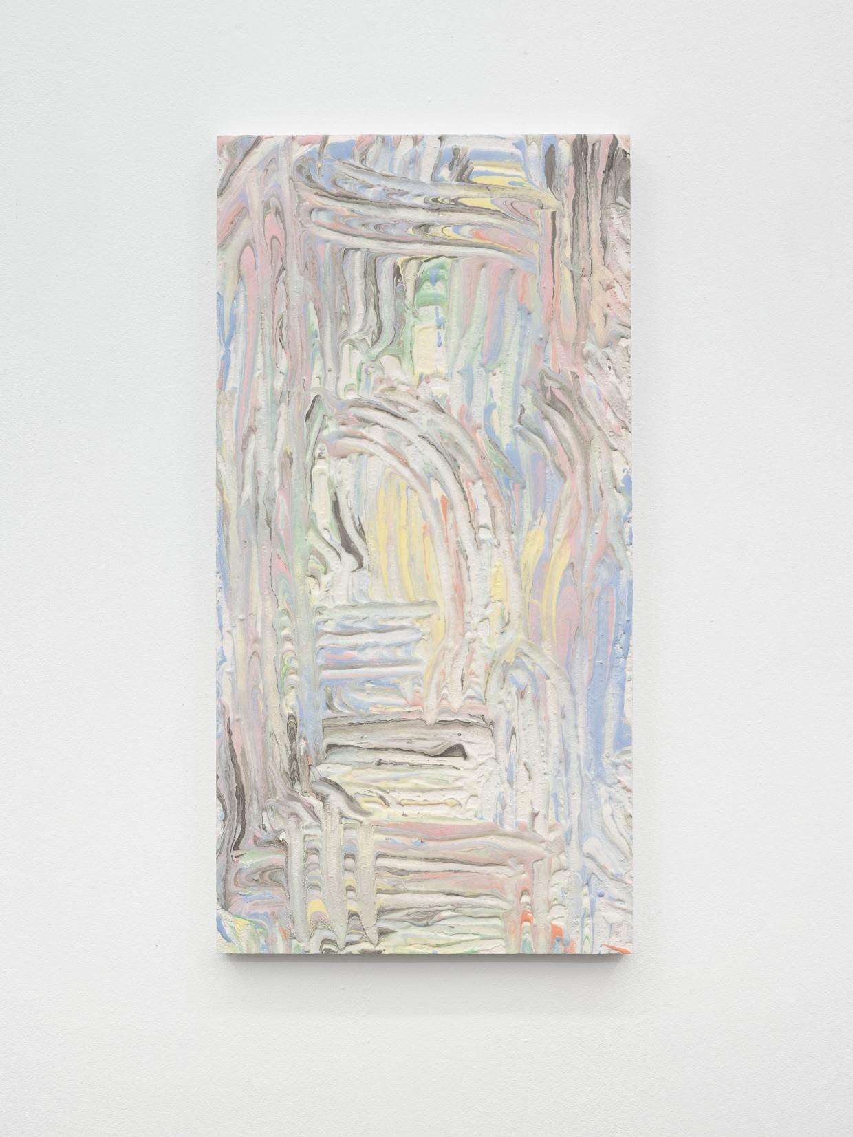 “Soluble Subjects” is a series of works ongoing since 2023. The objects, reminiscent of fragments of scenery or facades, explore a sculptural approach to painterly principles such as space, light, illusion, and representation. Diverse textures, drops, lumps, or chunks hint at various materials that only appear to exist in different consistencies or states of matter. They reveal material conditions such as hard, soft, solid, or (viscous-) liquid. The surfaces appear partly ephemeral and mutable, like snapshots within a changing process, as if in the process of dissolving themselves.